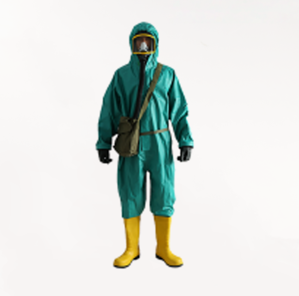 本品为连体式防护服:领口紧、袖口紧、裤脚紧服装轻便并易于活动、穿脱。轻型防护服型号规格符合GB/T 13640标准。轻型防护服等级: 一级。结构特点:水密封拉链,便于连接和脱开、材质耐酸碱、化学品腐蚀防化手套、防化胶靴、服装、手套、靴连为一体